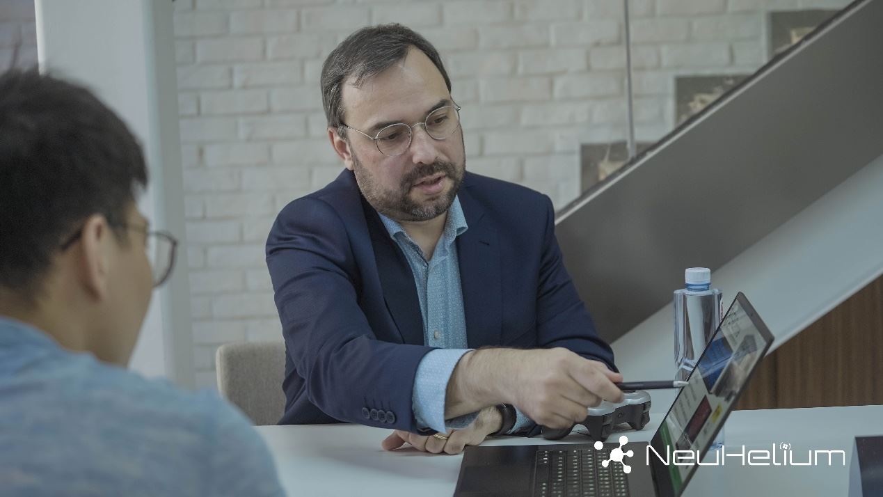 新氦類腦智能平臺(tái)常務(wù)副總經(jīng)理梁龍飛與林學(xué)民教授正進(jìn)行交流